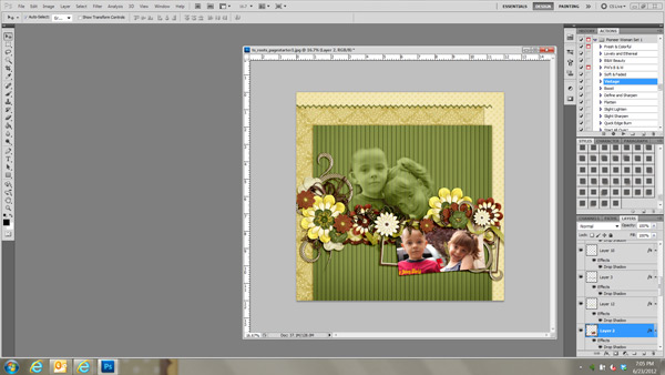 3. Add whatever other photos you want and start layering on the elements. I shadow as I go along, so make sure you are paying attention to the direction/opacity of the shadows on your page starter to make sure your are consistent. A note from Tracy herself on shadowing..."If your are using a Trixie Scraps page starter, I nearly always use a shadow angle of 43 and shadow color #2c1901 set to linear burn and lowered to somewhere between 40% and 65% opacity. The shadow depth and size would vary according to your preference for the element you are shadowing."